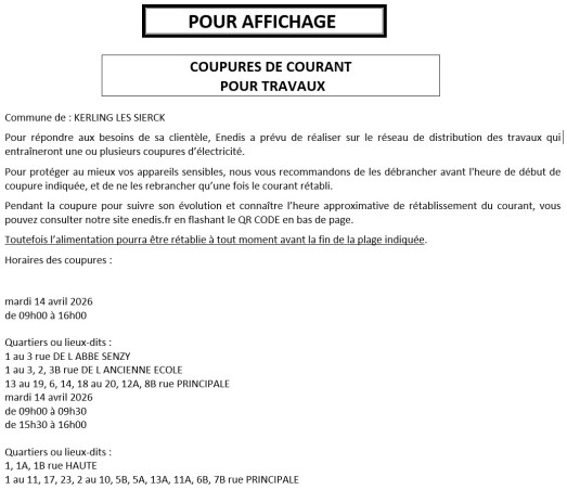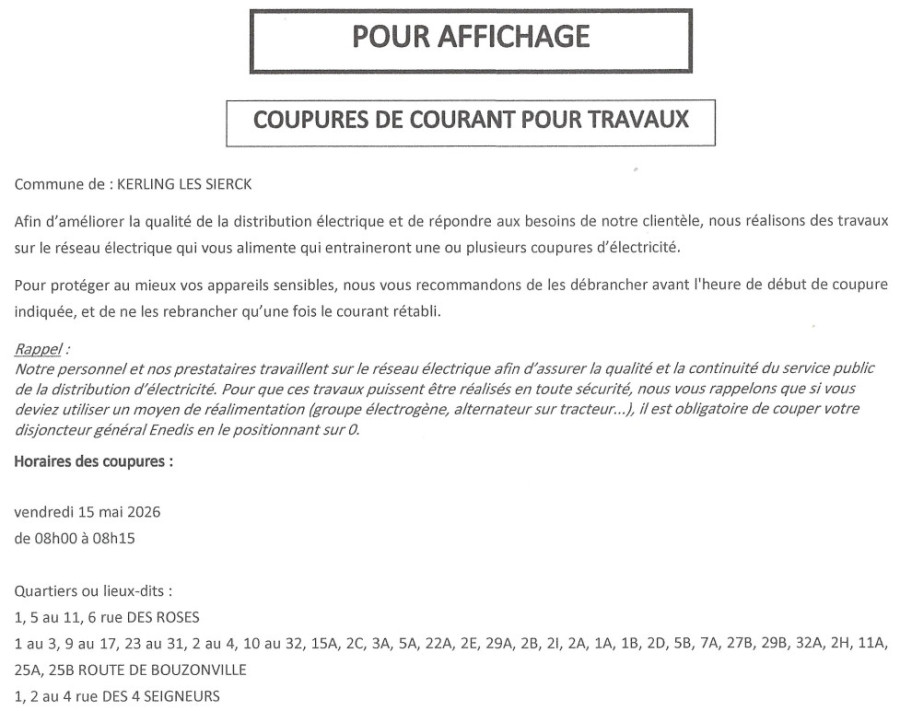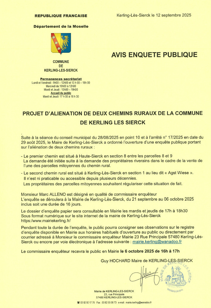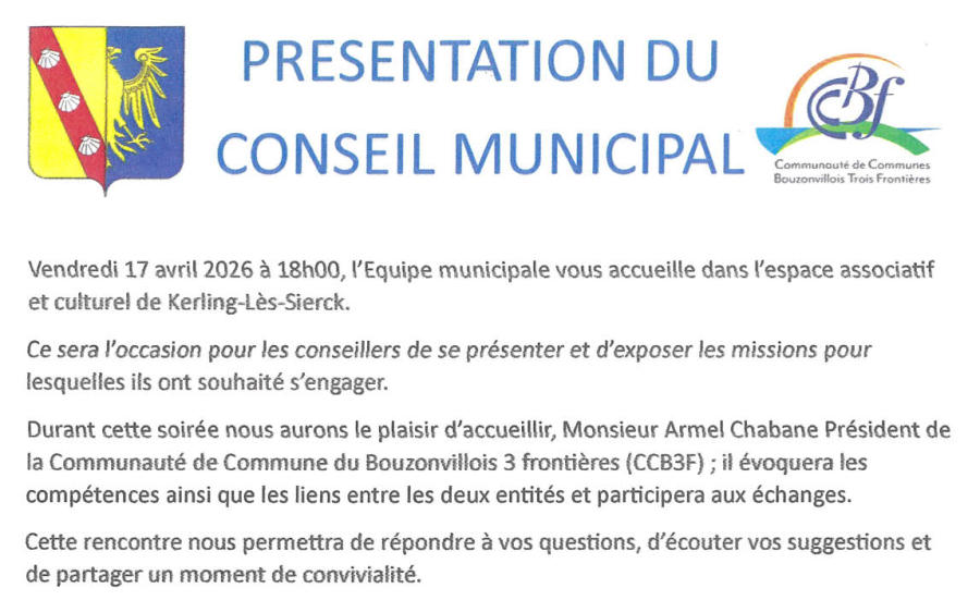 Pour les contraintes d'organisation, les habitants souhaitant participer à cette inauguration sont priés de le faire savoir en contactant la mairie (tél : 03.82.50.17.75. ou mail : mairie.kerling@wanadoo.fr) pour le 30 avril dernier délai.
